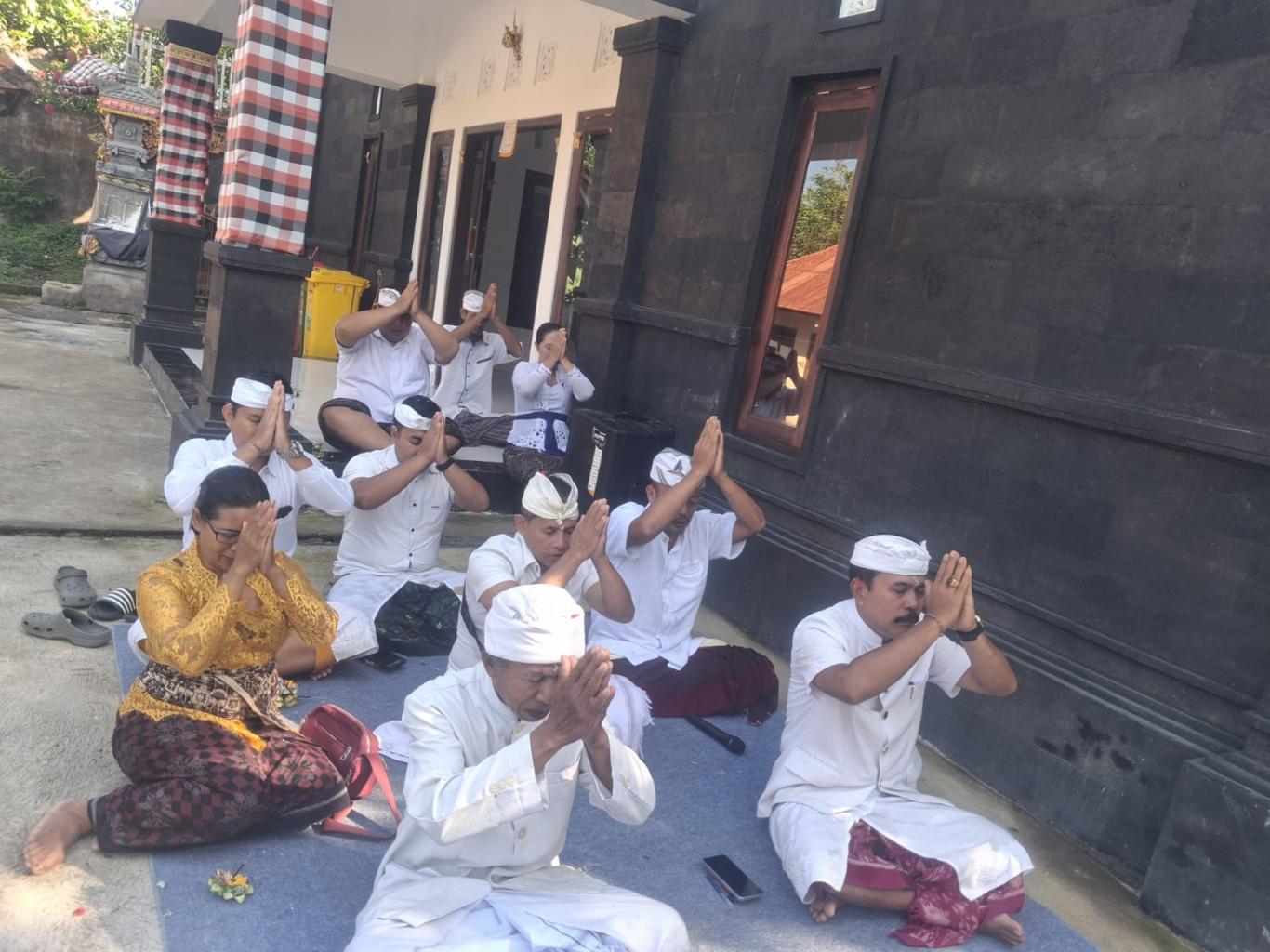 Acara yang dimulai sejak pagi hari ini dihadiri oleh Perbekel Panji Anom, jajaran perangkat desa, staf, serta BUMDes Karya Bakti Pertiwi. Suasana khidmat menyelimuti area kantor desa saat seluruh peserta melantunkan doa dan mengikuti prosesi persembahyangan dengan khusyuk.